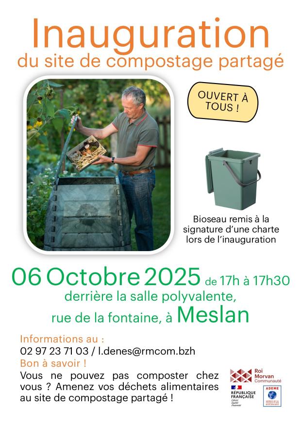Le lundi 6 octobre 2025 de 17h-17h30, la commune de Meslan et Roi Morvan Communauté vont inaugurer le site de compostage partagé communal. Celui-ci est installé derrière la salle polyvalente, rue de la Fontaine.