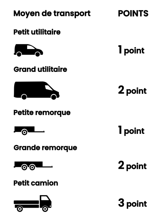 - Un système de points par catégorie de véhicule est appliqué. La valeur du point est fixée à 16€ dans les 3 déchèteries en 2026.